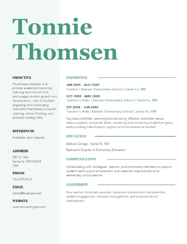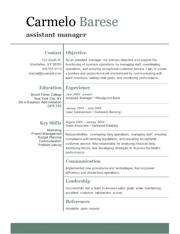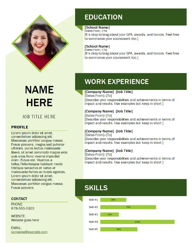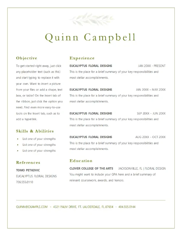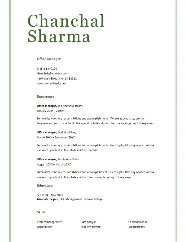 Your recent job title and the resume objective go hand-in-hand in the example templates for Word. The green color headings are a novelty design feature setting the essential headings apart from the rest of the content. Thus, using this template can be beneficial.