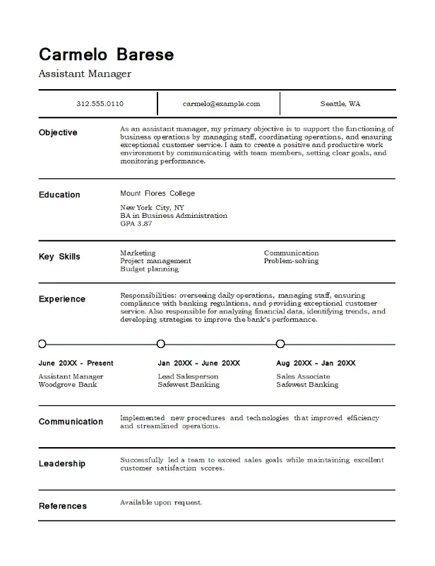 A basic resume in a Word document looks like the one above having a slight hint of color and design. The experience, education, and skills section is written effortlessly. Get similar Microsoft Word resumes in the link below.