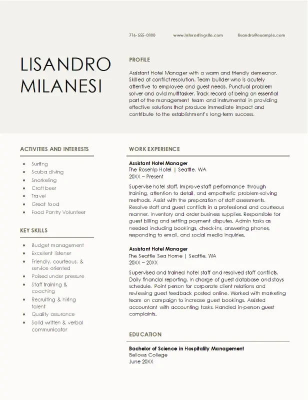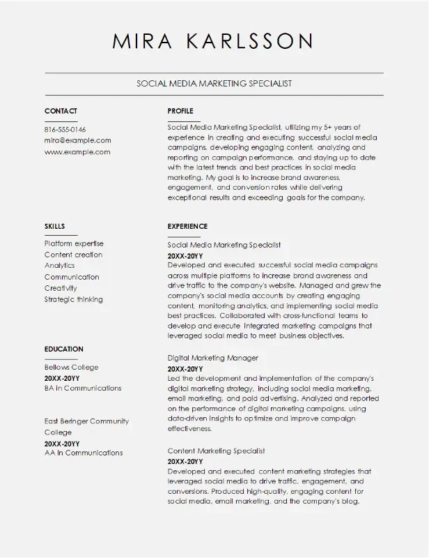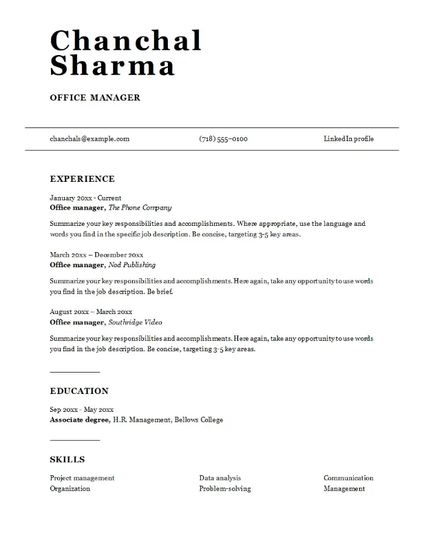 The placements of both a recent job title, name, and professional experience above each other are moderate as long as the example above is concerned. Do check out other similar templates for Word by referring to the link below.