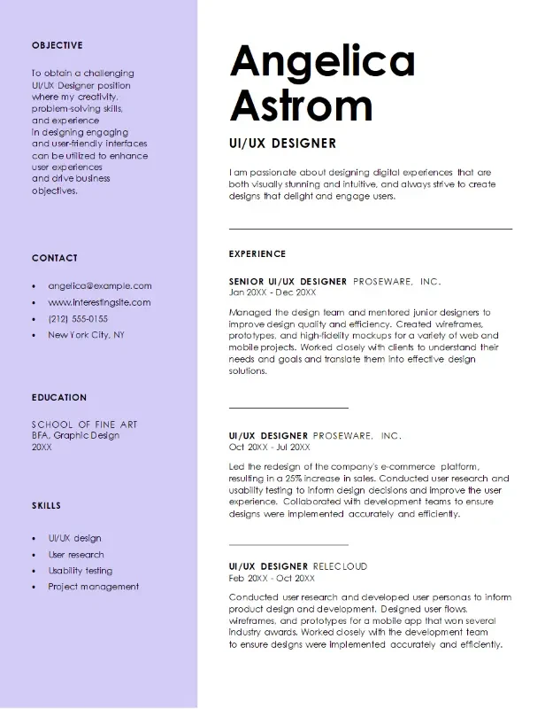 The Microsoft Word resume templates mentioned above have two columns, with the left one in a single color. It might have been easier to read if the text there were white.