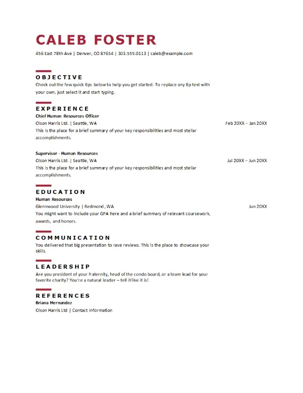 The magnificent job titles in bold red are capable of winning anyone's attraction. Moreover, the black bars horizontally running create a sense of top and bottom finish lines. Use it to create your own resume in Word.