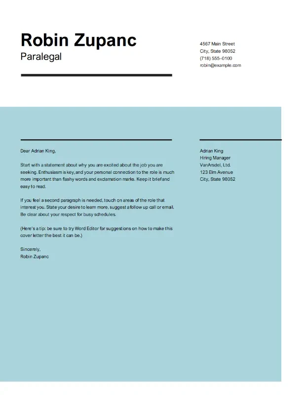 These paralegal job title templates for Microsoft Word are great for just about any resume. The combination of two shades, clean black fonts, and minimal shapes gives the design a polished yet approachable look. You can easily use this resume format Word for your next application.