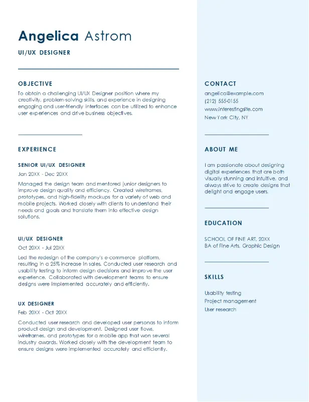 The orange vertical bar on the right and the dark blue faded horizontal bar at the top are some essential elements in templates for Word. Whether writing relevant skills, employment history, awards, or publication this template has it all. Just type resumes in the search bar when you visit the link below.